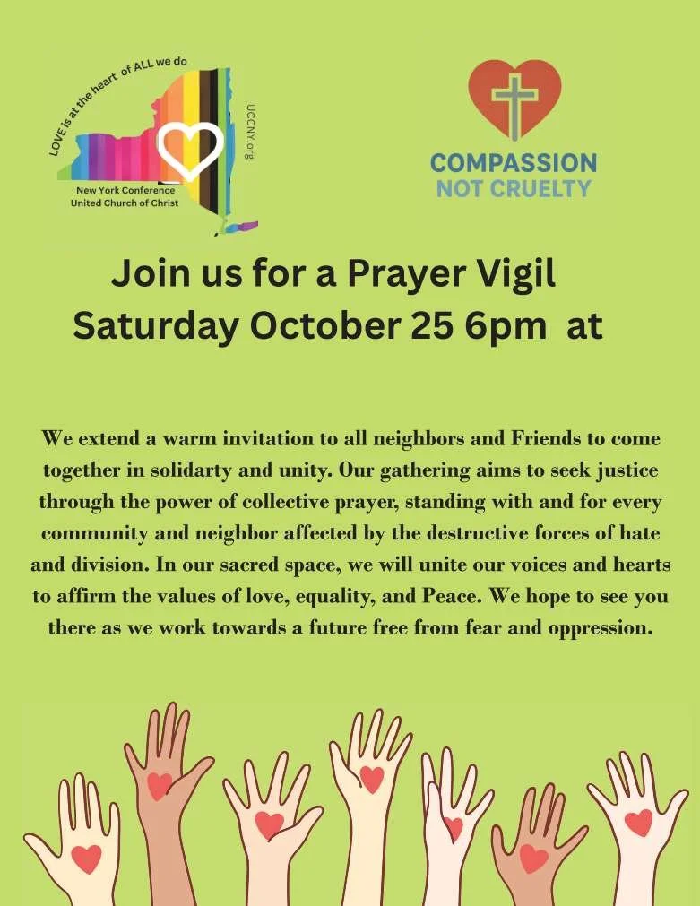 And please consider joining in an Interfaith Prayer Vigil on Saturday, October 25 from 6:00-7:00pm in our Sanctuary. We will be joining together with the all of Conference Ministers and many UCC congregations from across New York State as well as our Interfaith neighbors in prayer, proclaiming that God’s love doesn’t stop at artificially-drawn borders. God challenges us to break down all barriers that keep us from living out the ‘beloved community’ God intends.
